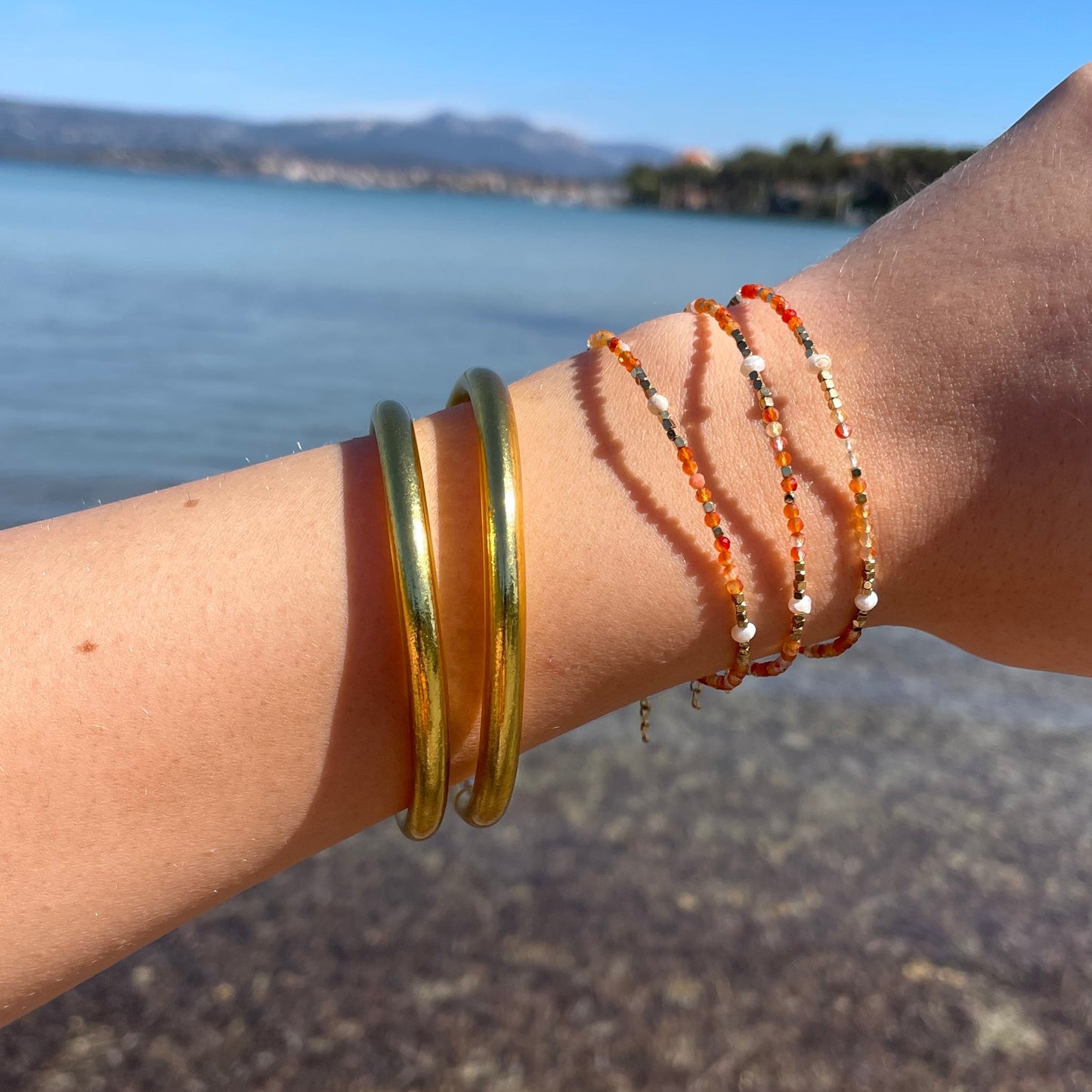 Avec sa touche de couleur chaleureuse, ce bracelet s’associe à merveille avec des bracelets chaînettes pour créer un effet accumulation tendance.