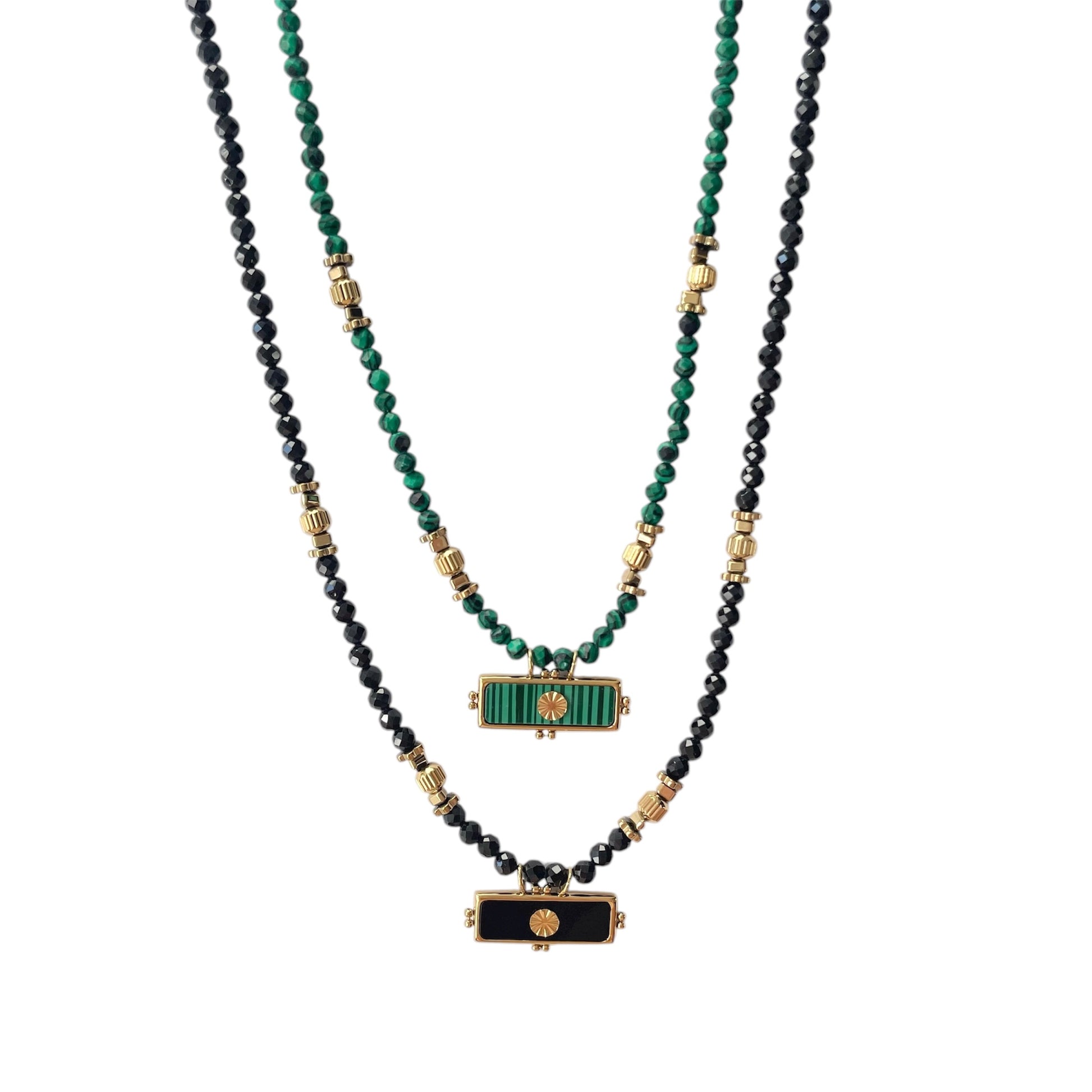 Collier Amulette composé de pierres naturelles malachite ou tourmaline noire et d’une petite plaque colorée.