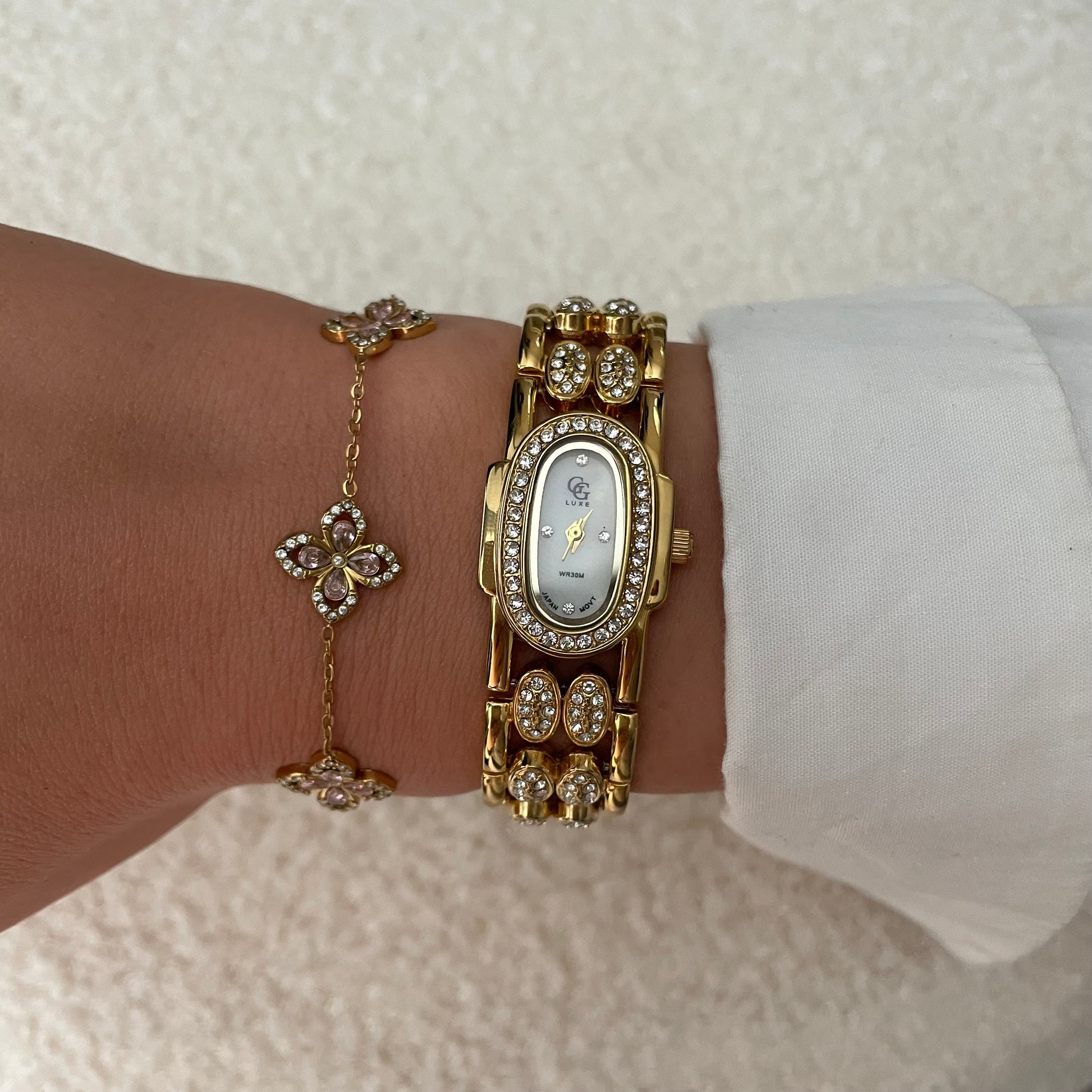 Montre vintage cadran ovale bracelet serti d’oxyde de zirconiums en acier inoxydable doré femme