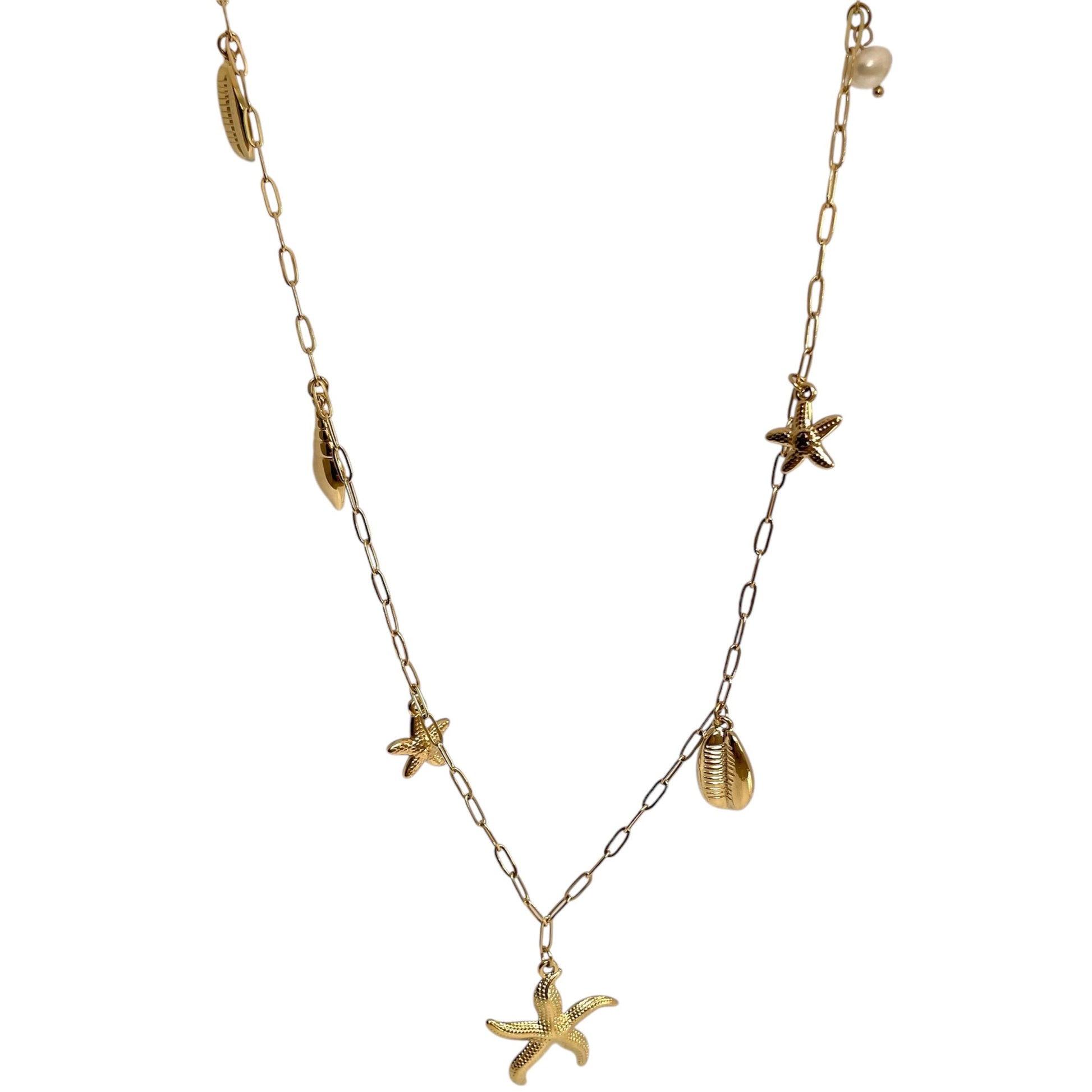 Collier sautoir Breloques coquillages, étoile de mer et perle en acier inoxydable